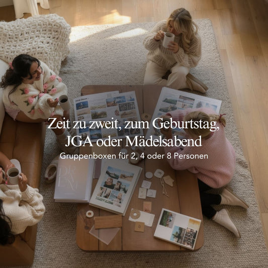 Die Boxen sind kein Spielzeug und nur für Personen ab 14 Jahren geeignet. Die Fragekarten, Guides mit den Anleitungen und unsere Sprache sind auf Erwachsene ausgelegt für eine gemeinsame kreative Auszeit zusammen. Dennoch spricht nichts dagegen unter Aufsicht und auf eigene Gefahr mit Kindern zu basteln (achtet hier zum Beispiel auf den Kleber und kleine, verschluckbare Kleinteile).
