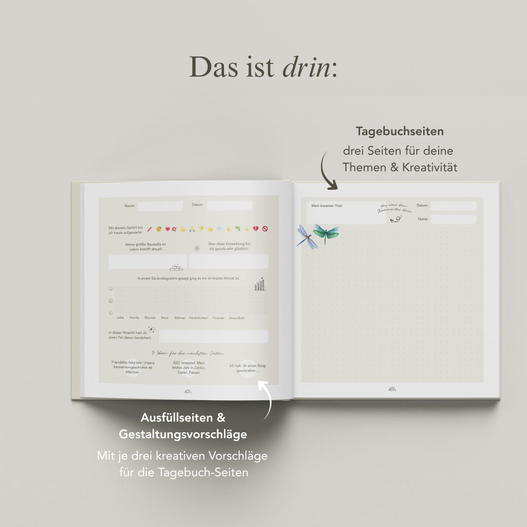 Impulse durch Ausfüllseiten und Themenvorschläge sowie freie Tagebuchseiten mit viel Platz für eigene Ideen